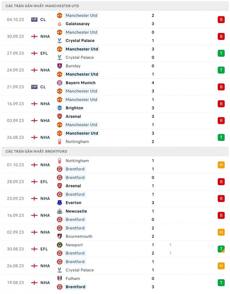 Thành tích gần đây của Man United và Brentford