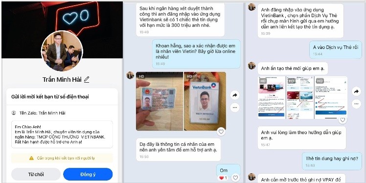 Khi anh băn khoăn xác nhận danh tính thì người này ngay lập tức gửi thông tin cá nhân bằng hình ảnh căn cước công dân và thẻ nhân viên ngân hàng Vietinbank mang tên Trần Minh Hải để chứng minh.