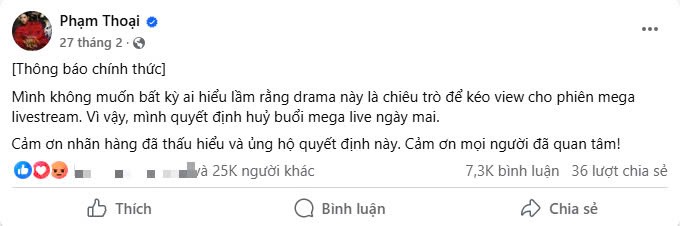 Trước đó, vào ngày 28/2, Phạm Thoại đột ngột hủy bỏ mega livestream – sự kiện được kỳ vọng sẽ cung cấp nhiều bằng chứng liên quan đến vụ từ thiện bé Bắp.