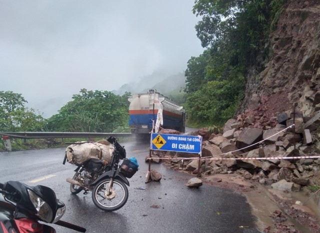 Xuất hiện một số điểm sạt lở khiến đất đá tràn ra đường trên tuyến QL 15D với khối lượng khoảng 250 m3
