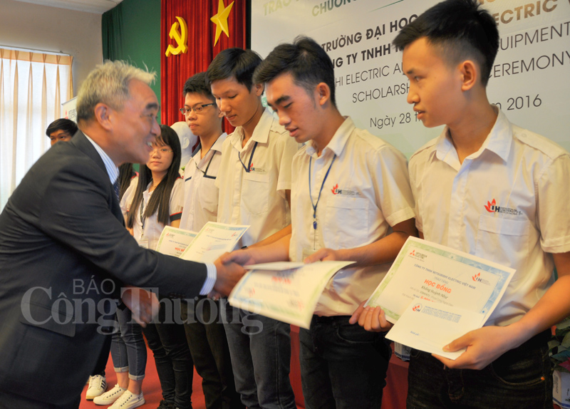 Cũng tại lễ bàn giao thiết bị tự động hóa, Mitsubishi Electric Việt Nam đã trao 50 triệu đồng học bổng cho sinh viên Khoa Công nghệ điện có thành tích học tập xuất sắc.