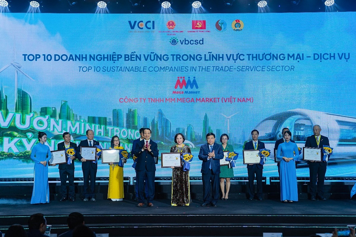Bà Trần Kim Nga (giữa), Giám đốc Đối ngoại của MM Mega Market đón nhận chứng nhận Top 10 Doanh nghiệp bền vững trong lĩnh vực Thương mại – Dịch vụ (Ảnh: Doanh nghiệp cung cấp) |
