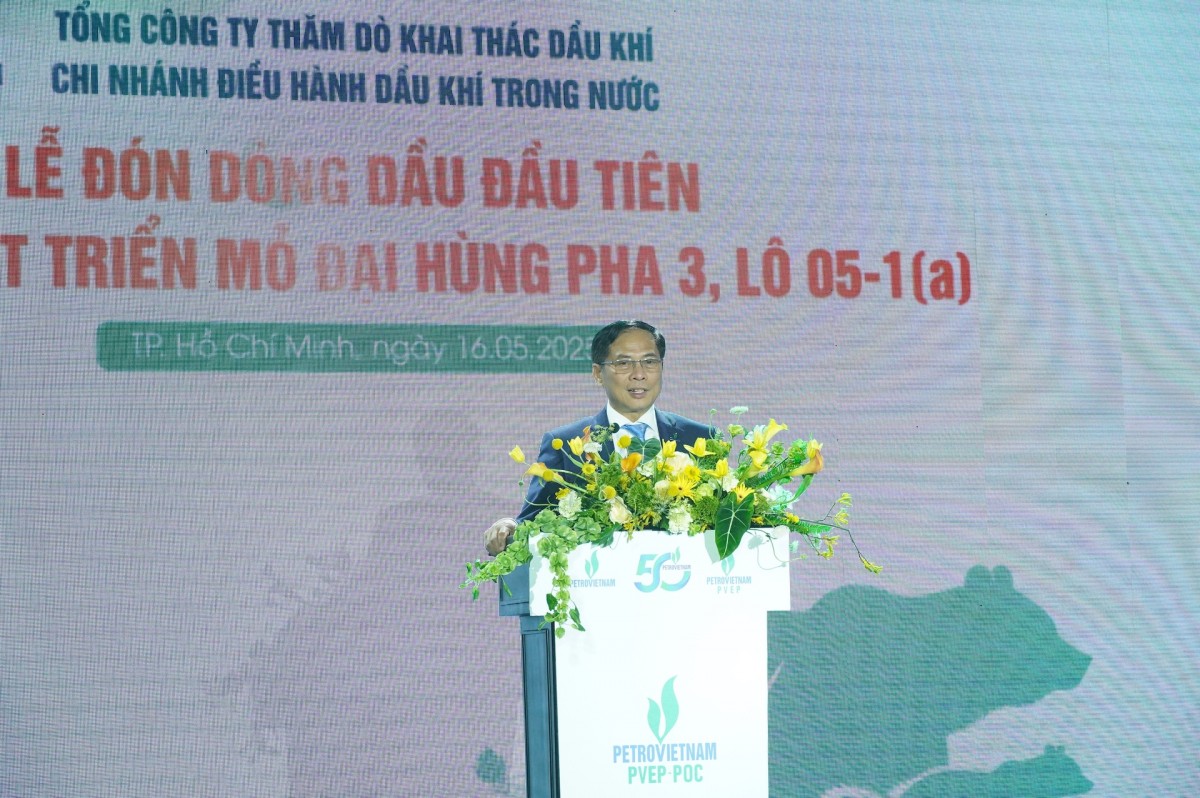 Phát biểu tại buổi lễ, Phó Thủ tướng Chính phủ, Bộ trưởng Bộ Ngoại giao Bùi Thanh Sơn biểu dương những thành tích xuất sắc mà tập thể Petrovietnam đã đạt được trong việc hoàn thành an toàn, đưa dòng dầu thương mại đầu tiên từ Pha 3 mỏ Đại Hùng vào khai thác vượt 20 ngày so với kế hoạch. Đây là một thành quả có ý nghĩa đặc biệt trong bối cảnh đất nước ta đang nỗ lực phát triển kinh tế, đảm bảo an ninh năng lượng và đẩy mạnh công cuộc chuyển dịch năng lượng theo hướng phát triển bền vững.