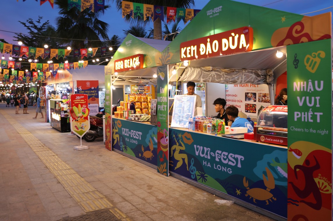 Không chỉ dừng lại ở đặc sản địa phương, chợ đêm VuiFest còn mang đến cho du khách cơ hội khám phá các thương hiệu nổi tiếng như Beard Papa’s, Toco Toco, và 7+ Mart với các đặc sản Quảng Ninh. Gian hàng ẩm thực tại đây thực sự là một “thiên đường” cho những ai yêu thích ẩm thực, từ những món ăn đường phố đến các món ăn quốc tế.