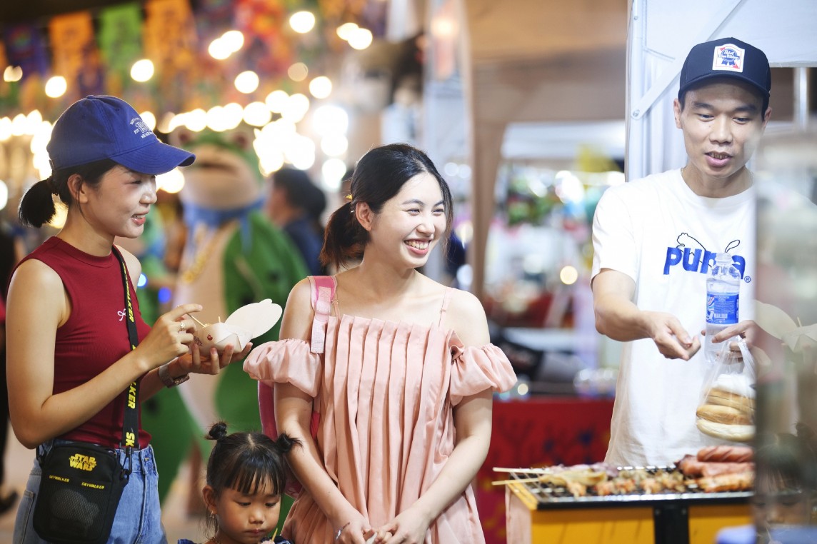 Tuyến phố thương mại VuiFest Ha Long được xây dựng theo mô hình chợ đêm giải trí đầu tiên xuất hiện tại miền Bắc. Quy tụ gần 100 lều bạt và 40 gian kiosk kinh doanh, chợ đêm này mang đến một không gian giao lưu văn hóa và ẩm thực hấp dẫn. Du khách có thể thưởng thức hàng loạt món ăn ngon, từ đặc sản Hạ Long như bánh cuốn chả mực, sữa chua trân châu, đến các món ăn độc đáo như gà nướng đất sét và gà nướng ống tre từ Tây Bắc.