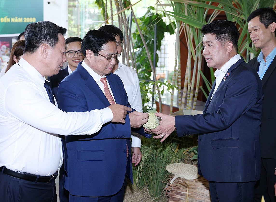 | Thủ tướng Phạm Minh Chính thăm gian hàng trưng bày các sản phẩm của Tây Ninh. Ảnh: Thu Hà |