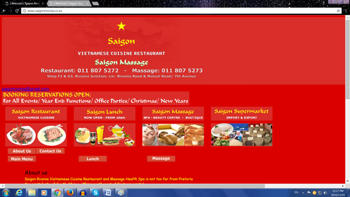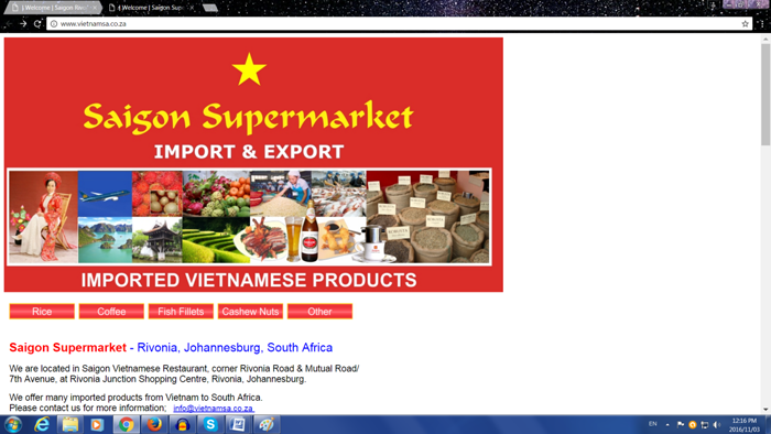 Thực hiện nhiệm vụ thúc đẩy xuất khẩu và kế hoạch công tác năm 2016 do Bộ Công Thương giao, Thương vụ Đại sứ quán Việt Nam tại Nam Phi phối hợp với doanh nghiệp Việt kiều xây dựng Siêu thị Hàng xuất khẩu Việt Nam trực tuyến tại Nam Phi trên trang web của Nhà hàng Sài Gòn tại địa chỉ www.saigonrivonia.co.za/.