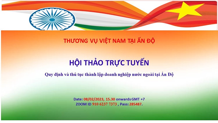 Đáp ứng nhu cầu của doanh nghiệp, ngày 8/2/2023,Thương vụ Việt Nam tại Ấn Độ phối hợp với các đơn vị liên quan sẽ tổ chức Webinar có chủ đề “Quy định và thủ tục thành lập doanh nghiệp nước ngoài tại Ấn Độ”. Diễn giả chính của chương trình là ông Manan Agarwal, giám đốc Công ty tư vấn KrayMan Consultants LLP, người có nhiều kinh nghiệm chuyên môn về luật doanh nghiệp, các quy định về thành lập doanh nghiệp, các thủ tục về thuế, hải quan; Đại diện các ngân hàng Ấn Độ trao đổi các thủ tục liên quan thanh toán, mở tài khoản ngân hàng, nộp thuế...