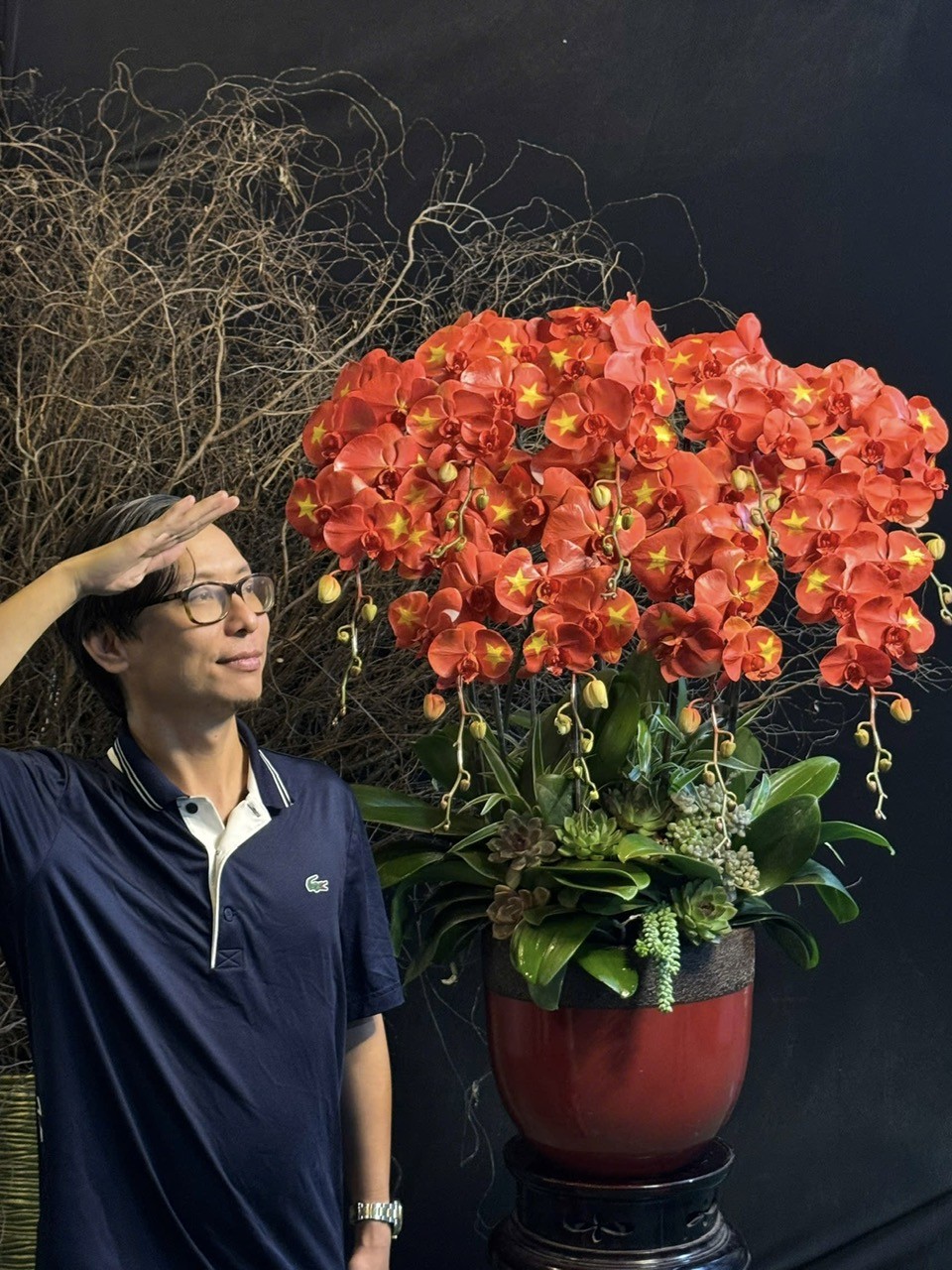 | Chủ tiệm hoa Dương Linh - người đưa ý tưởng phác họa hình ảnh Tổ quốc trên hàng trăm bông hoa lan. Ảnh Thu Thủy |