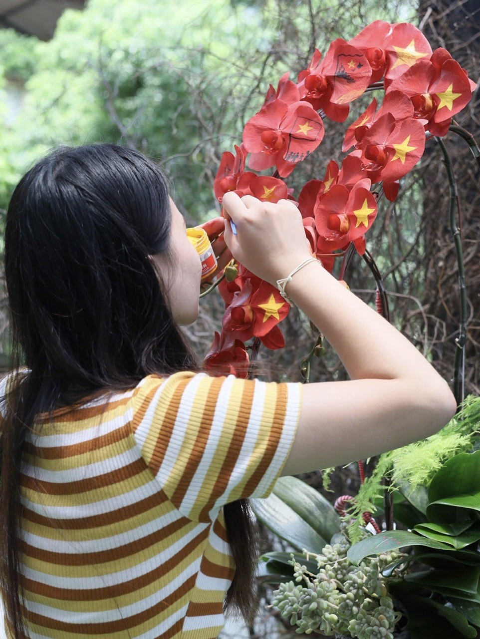 | Thêm một lần được thấy Tổ quốc trong những bông hoa lan đủ sắc màu là niềm tự hào của các bạn trẻ khi khắc họa hình ảnh cờ đỏ sao vàng. Ảnh Thu Thủy |