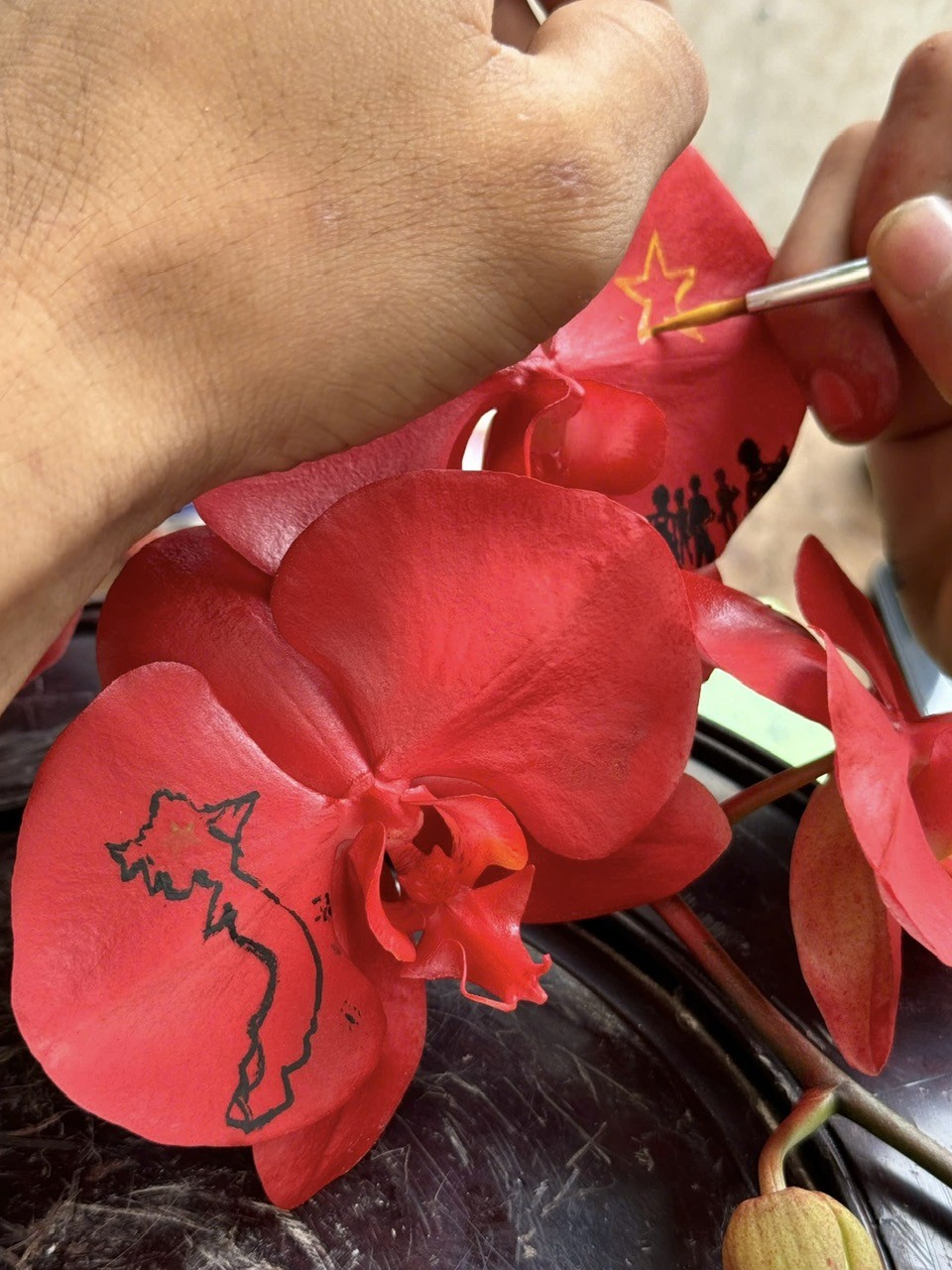Chủ tiệm hoa Dương Linh chia sẻ: “Một cây hoa có nhiều hình lá cờ Tổ quốc, sao vàng 5 cánh sẽ có nhiều người làm, người lên ý tưởng, người trồng người sơn, người vẽ… Đặc biệt, với các họa tiết như sao vàng, lăng Bác Hồ... thì cần tỉ mỉ, có khi vẽ cả tiếng đồng hồ mới xong một hình nho nhỏ trên cánh hoa. Nhưng được vẽ, được chiêm ngưỡng hình ảnh đất nước Việt Nam mình trong những ngày rợp cờ hoa Quốc khánh 2/9 là một điều hạnh phúc và niềm tự hào với tôi và nhiều bạn trẻ khác”.