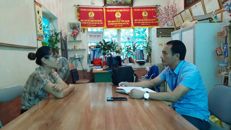 Chị Vũ Thị Mai Loan - Chủ tịch Công đoàn Công ty TNHH Giầy Aleron Việt Nam trao đổi với phóng viên Báo Công Thương điện tử |