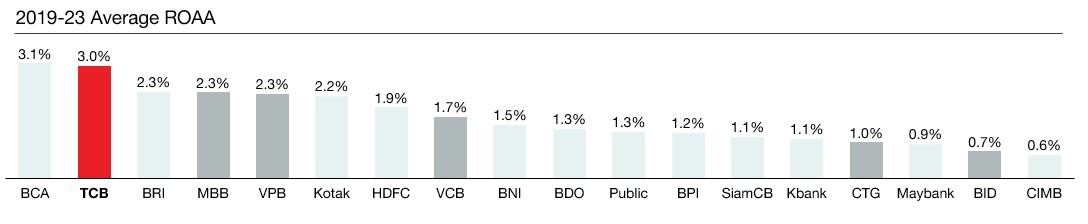 Theo số liệu được S&P Capital IQ công bố cuối tháng 2/2024 về chỉ số ROA của các ngân hàng Đông Nam Á và Ấn Độ có giá trị sổ sách trên 3 tỷ USD trong giai đoạn 2019 - 2023, Ngân hàng Trung ương châu Á (BCA) của Indonesia và Techcombank (Việt Nam) đang dẫn đầu với chỉ số ROA lần lượt là 3,1% và 3%.