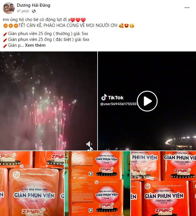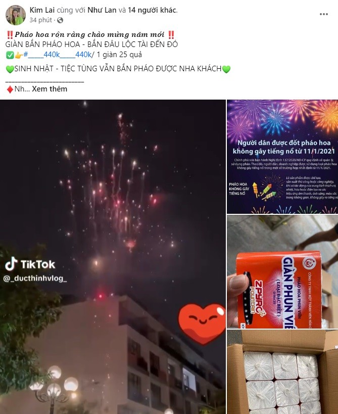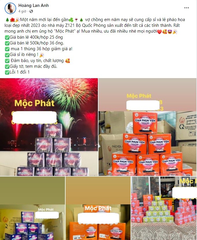 Nhiều chủ tài khoản facebook khẳng định, toàn bộ số pháo hoa được đăng bán là pháo do Bộ Quốc phòng sản xuất nên đảm bảo tính hợp pháp, đầy đủ hóa đơn, chứng từ và an toàn cho người sử dụng. Cách thức rao bán pháo hoa qua mạng xã hội khá đa dạng.