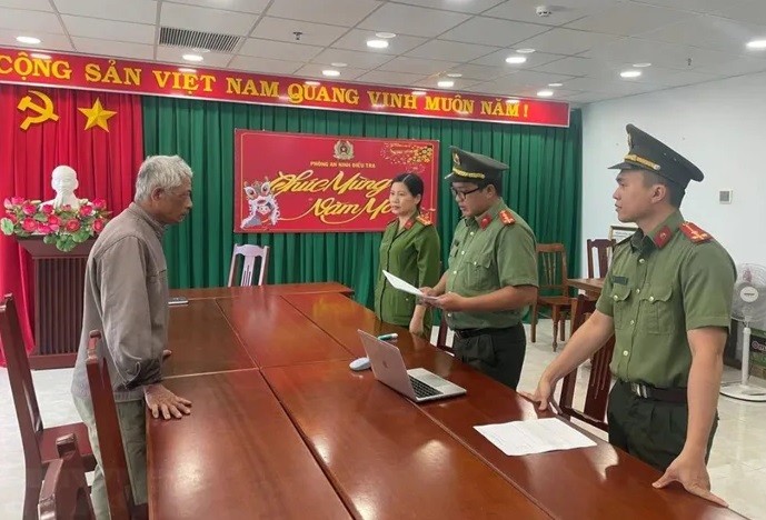 | Công an tỉnh Ninh Thuận tống đạt lệnh bắt tạm giam đối với Võ Quý Nam - Ảnh: TTXVN phát |