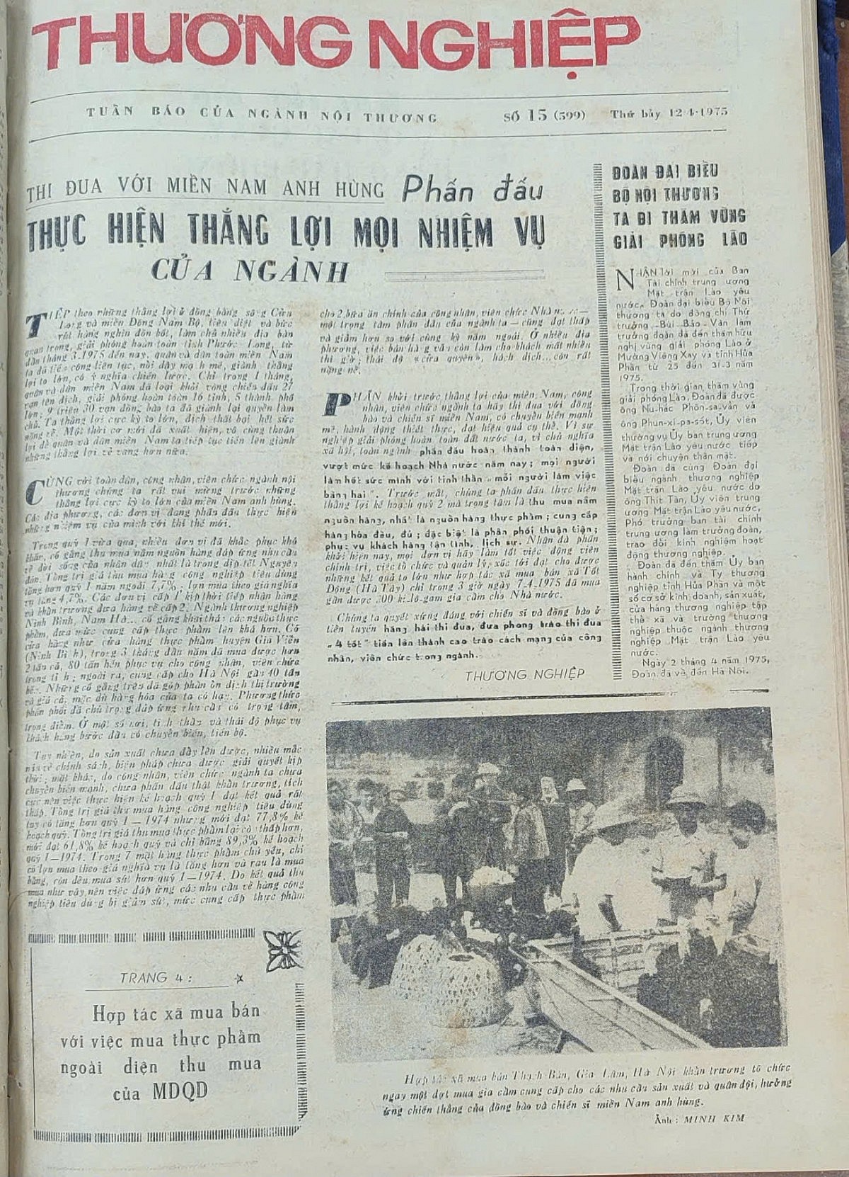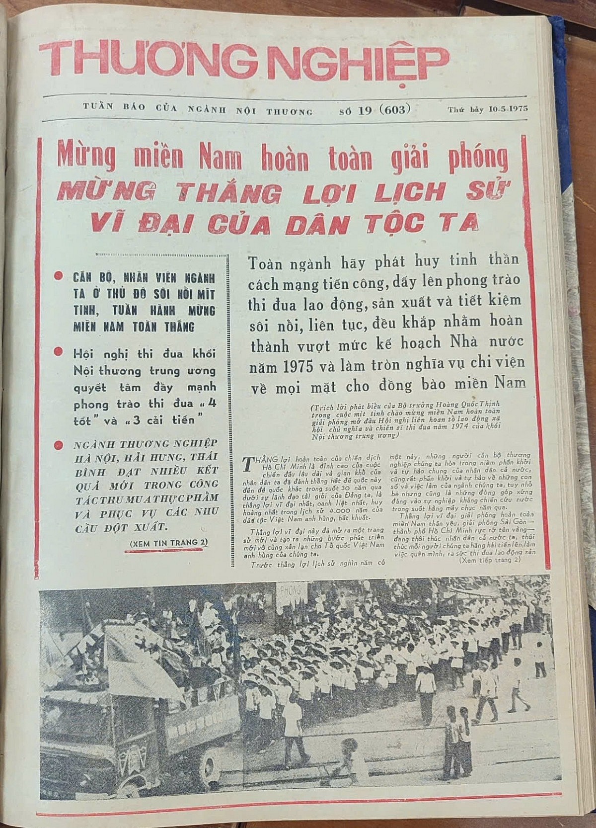 Tờ Thương nghiệp số 19 (603), thứ bảy ngày 10-5-1975 ấn tượng với dòng chữ đỏ chạy ngang tờ báo: “Mừng miền nam hoàn toàn giải phóng. Mừng thắng lợi lịch sử vĩ đại của dân tộc ta”. Trong niềm vui rực rỡ cờ hoa, bài báo nêu rõ: “Toàn ngành hãy phát huy tinh thần cách mạng tiến công, dấy lên phong trào thi đua lao động, sản xuất và tiết kiệm sôi nổi, liên tục, đều khắp nhằm hoàn thành vượt mức kế hoạch Nhà nước năm 1975 và làm tròn nghĩa vụ chi viện về mọi mặt cho đồng bào miền Nam (Trích lời phát biểu của Bộ trưởng Hoàng Quốc Thịnh trong cuộc mít tinh chào mừng miền Nam hoàn toàn giải phóng mở đầu Hội nghị liên hoan tổ lao động xã hội chủ nghĩa và chiến sĩ thi đua năm 1974 của khối Nội thương trung ương). |
