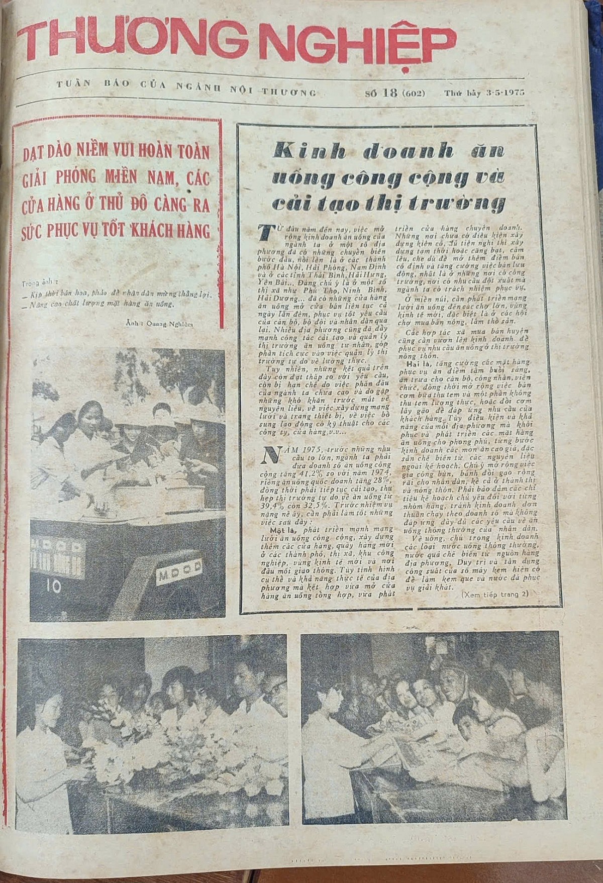 Trên trang nhất Tờ Thương nghiệp số 18 (602) thứ bảy ngày 3-5-1975 là bức ảnh thay vạn lời nói: Dạt dào niềm vui hoàn toàn giải phóng miền Nam, các cửa hàng ở Thủ đô càng ra sức phục vụ tốt khách hàng. Trong ảnh: Kịp thời bán hoá, pháo để nhân dân mừng thắng lợi; - Nâng cao chất lượng mặt hàng ăn uống. Dòng chữ đỏ rực trên nền trắng, bức ảnh đen trắng nhưng không giấu được nét rạng rỡ của những người may mắn được chứng kiến thời khắc lịch sử khi miền Nam hoàn toàn giải phóng, Bắc – Nam chung một dải là những khoảnh khắc không thể nào quên. |