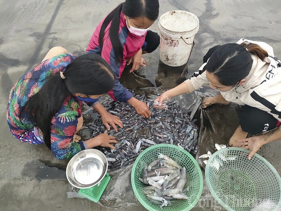 Gia đình có nghề câu mực bằng thuyền thúng, chị Hải ở phường Nghi Thủy, TX. Cửa Lò vui vẻ nói, tới mùa câu mực đàn ông trong nhà ra khơi, đàn bà ở trên bờ chờ mực về mang đi bán.
