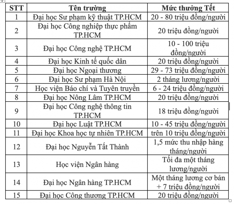 Trước đó, Tết Nguyên đán năm 2023, các trường đại học thưởng Tết cho nhân viên, cán bộ, người lao động cao nhất 100 triệu đồng/người tại Trường Đại học Công nghệ TP.Hồ Chí Minh. Mức thưởng thấp nhất 1 tháng lương/người.