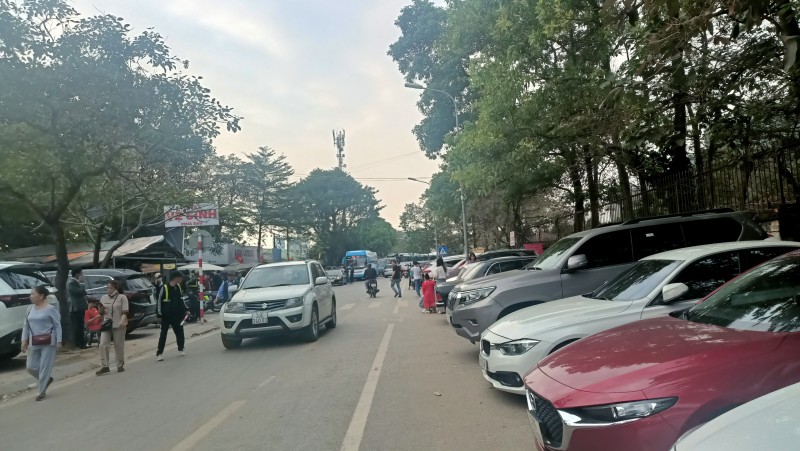 | Ô tô xếp kín hai bên đường dẫn vào Phủ Tây Hồ. Theo ghi nhận, có nhiều xe mang biển số của các tỉnh, thành khác nhau |