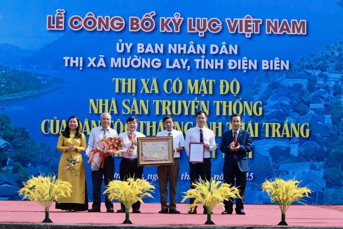 | Đại diện Tổ chức Kỷ lục Việt Nam trao xác lập kỷ lục Việt Nam “Thị xã có mật độ nhà sàn truyền thống của dân tộc Thái ngành Thái Trắng nhiều nhất Việt Nam” cho thị xã Mường Lay (tỉnh Điện Biên). Ảnh: CTV |