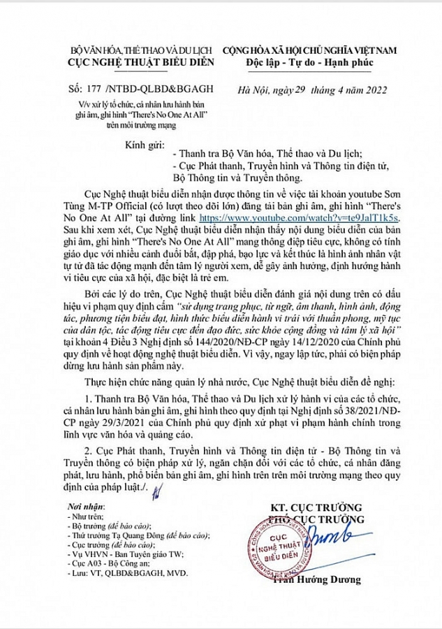| Văn bản đề nghị dừng phát hành MV “There's No One At All” của Cục Nghệ thuật biểu diễn |