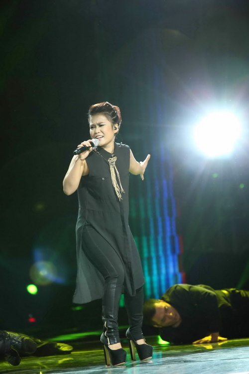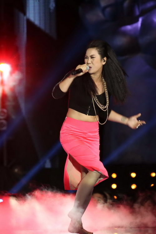 Bỏ đôi giày cao gót sang một bên, "mỹ nhân" đội Quốc Trung thoải mái di chuyển trên sân khấu với đôi chân trần và không quên "cháy bỏng" với những đoạn gằn giọng cực chất. HLV Mỹ Linh còn tiết lộ rằng trong những câu chuyện bên lề giữa các HLV, Hà My được cho là thí sinh tốt nhất đội Quốc Trung.