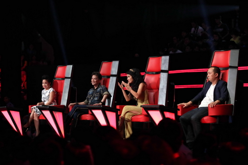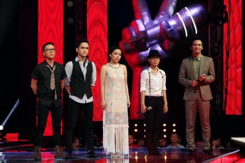 Các thí sinh và huấn luyện viên trong đêm liveshow 2 Giọng hát Việt
