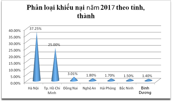 Trong năm 2017, Hà Nội và TP. Hồ Chí Minh là 2 thành phố có nhiều phản ánh, khiếu nại nhất về vi phạm quyền lợi người tiêu dùng (tương ứng 371 và 249 vụ việc, chiếm ty lệ lần lượt là 37,25% và 25% tổng số khiếu nại). Hai thành phố này chiếm tỉ lệ cao hơn rất nhiều so với các tỉnh, thành xếp sau đó như Đồng Nai, Nghệ An, Hải Phòng, Bắc Ninh, Bình Dương với tỷ lệ khoảng 1-3%.