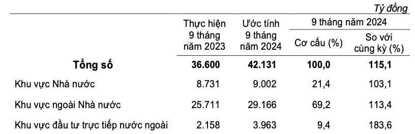Trong đó, vốn Nhà nước 9.002 tỷ đồng, chiếm 21,4% và tăng 3,1%; vốn ngoài Nhà nước 29.166 tỷ đồng, chiếm 69,2% và tăng 13,4%; vốn đầu tư trực tiếp nước ngoài 3.963 tỷ đồng, chiếm 9,4% và tăng 83,6%.