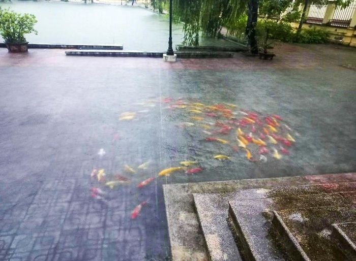 Trong nhiều ngày qua, do ảnh hưởng của áp thấp nhiệt đới, trên địa bàn huyện Ý Yên có mưa rất to, khiến một số nơi bị ngập úng, ở dưới khu nhà ăn của huyện bị tắc nên nước ngập lên sân, chính vì vậy đàn cá theo nước bơi lên sân”, ông Liệu cho biết.