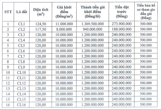 Đại diện Công ty Đấu giá hợp danh DVL cho biết, buổi đấu giá sẽ được thực hiện theo hình thức bỏ phiếu trực tiếp 01 vòng với từng lô đất, theo phương thức trả giá lên. Giá khởi điểm các lô đất này từ 8 - 11 triệu đồng/m2, trong đó đa số có giá khởi điểm ở mức 8 triệu đồng/m2 và 10 triệu đồng/m2.