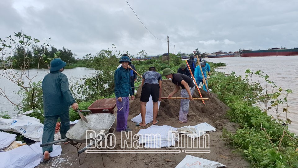 Lực lượng tại chỗ huyện Trực Ninh đắp bao cát chống tràn bảo vệ bối Phương Định, tỉnh Nam Định. Ảnh: Báo Nam Định