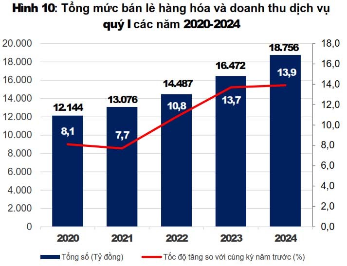Theo giá hiện hành, tổng mức bán lẻ hàng hóa và doanh thu dịch vụ quý I/2024 có quy mô và tốc độ tăng so với cùng kỳ năm trước cao nhất trong giai đoạn 2020-2024. Tổng mức bán lẻ hàng hóa và dịch vụ quý I/2024 đạt 18.756 tỷ đồng, gấp 1,54 lần so với quý I năm 2020 - năm xảy ra dịch Covid-19 và tăng 13,9% so với cùng kỳ năm trước.