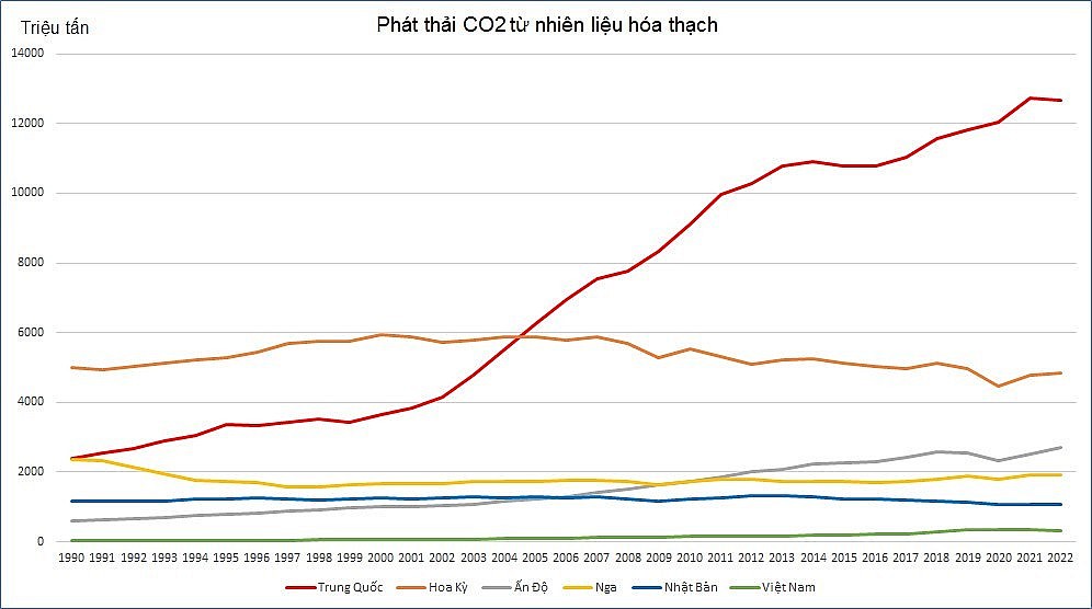 Hãy cùng chuyên gia Tạp chí Năng lượng Việt Nam điểm xem: Năm 2023, Trung Quốc, Mỹ, Ấn Độ, Nga, Nhật Bản - 5 quốc gia phát thải khí CO2 từ nhiên liệu hóa thạch nhiều nhất thế giới (chiếm 60,2% lượng khí CO2 nhiên liệu hóa thạch thải ra năm 2022 của toàn thế giới) đã đi đến đâu trên hành trình tới Net zero và so sánh với Việt Nam.