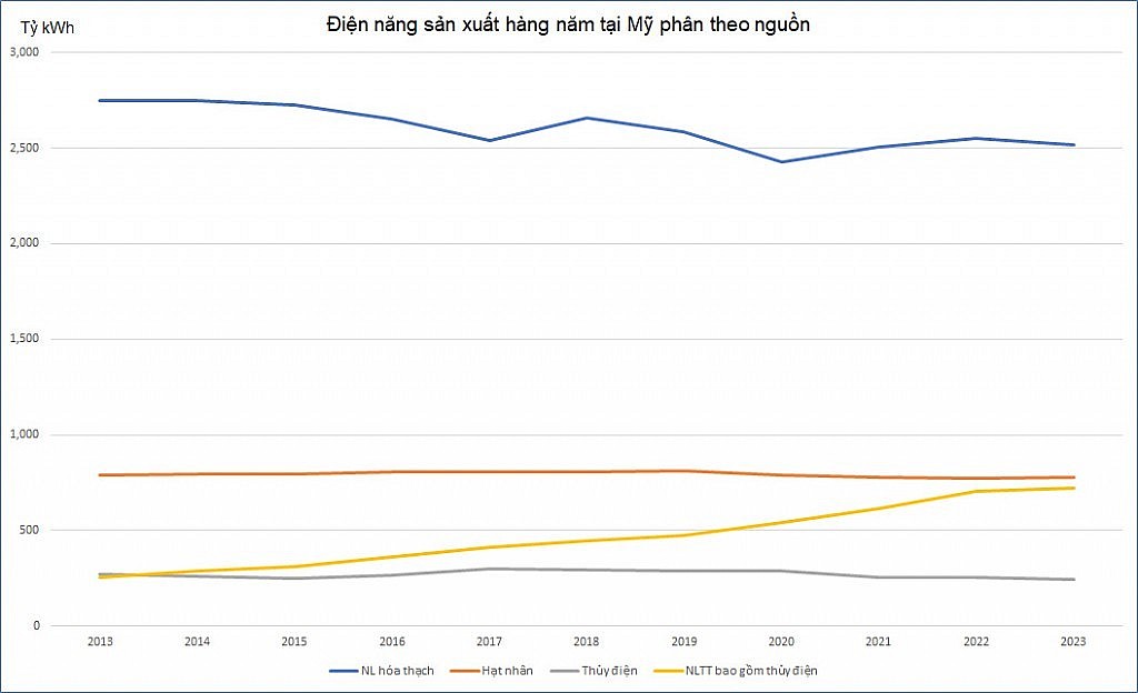 [* Số liệu của Mỹ tính toán dựa trên báo cáo 11 tháng của 2023, cơ quan EIA. ** Năng lượng phi hóa thạch (bao gồm năng lượng tái tạo, thủy điện và điện hạt nhân)].