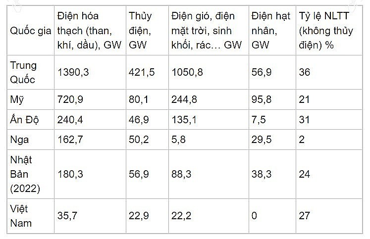 Số liệu trong bảng cho thấy: Dù Việt Nam chưa có nhà máy điện hạt nhân, nhưng tỷ lệ năng lượng tái tạo và tỷ lệ năng lượng phi hóa thạch thuộc vào loại cao trên thế giới. Với tỷ lệ năng lượng tái tạo cao, việc điều độ hệ thống điện trở nên khó khăn hơn rất nhiều so với hệ thống có điện hạt nhân và nhiệt điện cao.