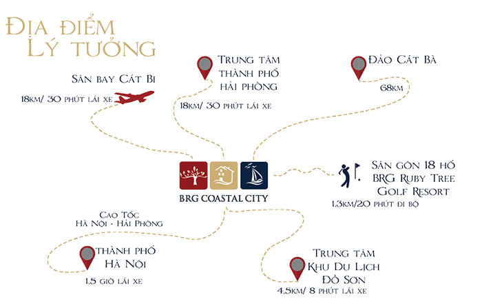 Tọa lạc trên trục đường lớn nối thủ phủ Hải Phòng và đặc khu du lịch nổi tiếng Đồ Sơn, BRG Coastal City có tổng diện tích 350 ha chỉ cách trung tâm thành phố Hà Nội hơn 1 giờ lái xe khi di chuyển qua đường cao tốc Hà Nội - Hải Phòng, con đường đầu tiên của Việt Nam xây dựng theo tiêu chuẩn quốc tế; chỉ 8 phút lái xe tới khu du lịch Đồ Sơn; 30 phút tới trung tâm thành phố Hải Phòng. Quần thể biệt thự nghỉ dưỡng hướng biển BRG Coastal City hưởng lợi từ hệ thống giao thông vận tải thuận tiện, là một lựa chọn ưu tiên cho cư dân ở khu vực phía Bắc nói chung và các tỉnh lân cận Hải Phòng như Hà Nội, Quảng Ninh nói riêng cho những kỳ nghỉ của mình.