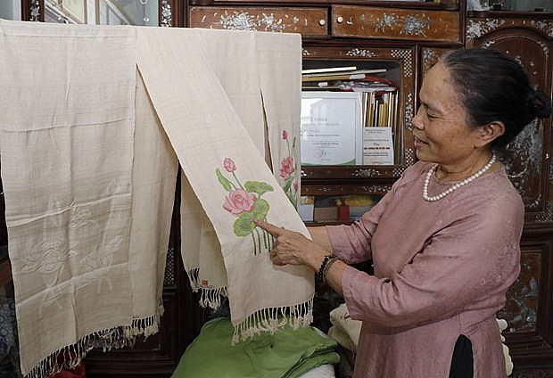 | Sản phẩm vải từ tơ sơn của Nghệ nhân Phan Thị Thuận đã được công nhận OCOP 5 sao TP Hà Nội được nhiều năm |