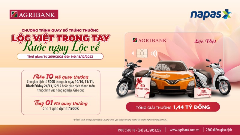 Từ 26/09/2023 đến hết ngày 15/12/2023, Công ty Cổ phần Thanh toán Quốc gia Việt Nam (NAPAS) và Ngân hàng Nông nghiệp và Phát triển Nông thôn Việt Nam (Agribank) triển khai chương trình "Lộc Việt trong tay – rước ngay Lộc về" dành cho khách hàng cơ hội trúng hàng trăm quà tặng với tổng giá trị lên đến 1,5 tỷ đồng.