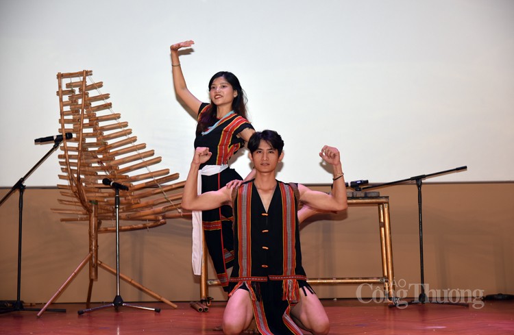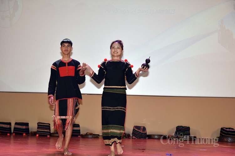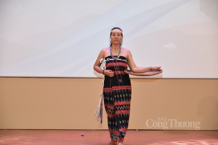 | Dân tộc Cơ Tu kết hợp trình diễn trang phục truyền thống với những dụng cụ lao động sản xuất |