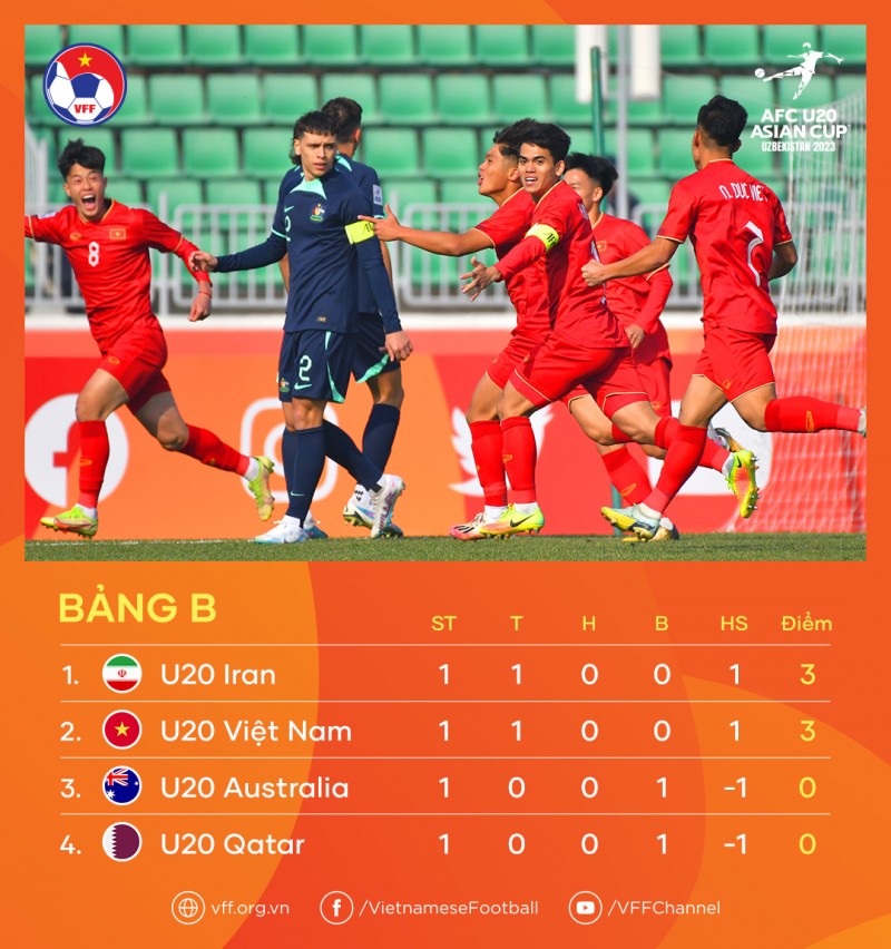 Với kết quả trên, U20 Việt Nam đang cùng U20 Iran xếp ngôi đầu khi cùng có 3 điểm và hiệu số là +1 (U20 Iran thắng U20 Qatar 1-0). Điều đó cho thấy, U20 Việt Nam và U20 Iran cùng có cơ hội sở hữu tấm vé sớm vào tứ kết U20 châu Á 2023.