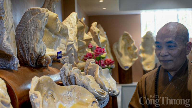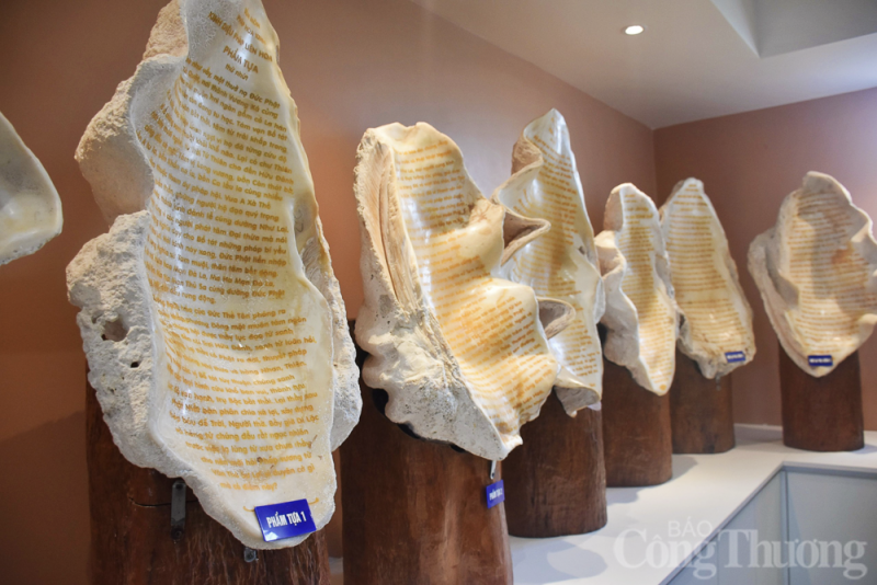 Có 70 tác phẩm điêu khắc trên vỏ ốc tai tượng, trong đó 59 vỏ ốc điêu khắc tượng Phật, Bồ tát, Thánh tăng, các thắng cảnh; 11 vỏ ốc điêu khắc bộ Kinh Bổn Môn Pháp Hoa. Những vỏ ốc kích thước khác nhau cao nhất khoảng 80cm, rộng 50cm, nặng từ 3kg trở lên. Điều đặc biệt, những vỏ ốc tai tượng này được mang về từ Trường Sa và được các nghệ nhân ở TP Phan Thiết (tỉnh Bình Thuận) điêu khắc ròng rã hơn một năm để có thể thành hình. |