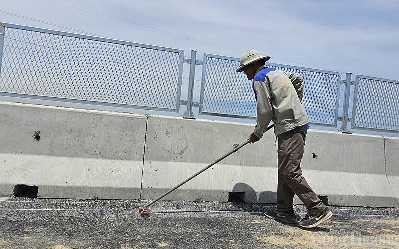 Ông Phạm Văn Minh - Phó trưởng Ban Quản lý dự án 6, Bộ Giao thông vận tải (GTVT) cho biết: Đến thời điểm hiện tại, đoạn cao tốc Nghi Sơn - Diễn Châu đã hoàn thiện 97% giá trị khối lượng. 3% giá trị khối lượng còn lại ở một số tuyến đường gom chưa được hoàn thành. Trong ảnh, một số khe co giãn cầu vượt trên tuyến đang được hoàn thiện.