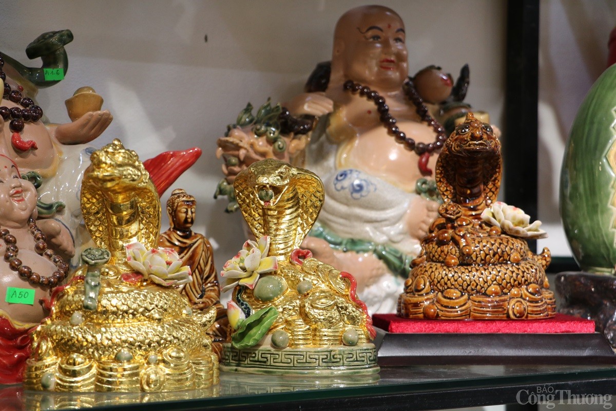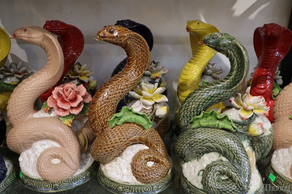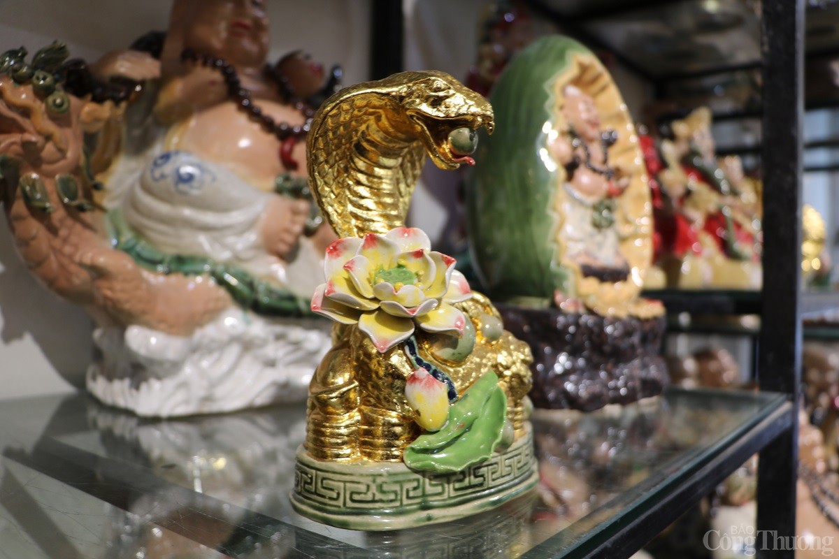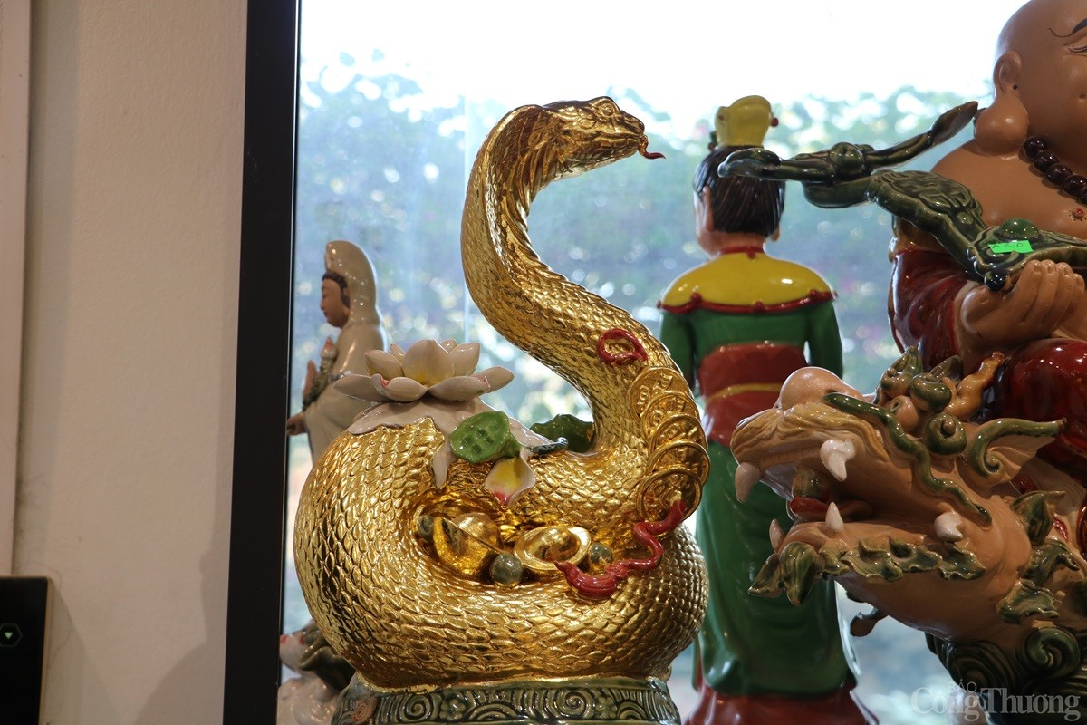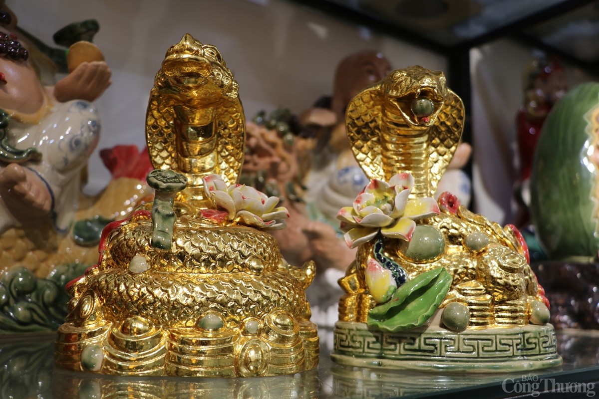 Tại làng nghề gốm sứ Bát Tràng (xã Bát Tràng, huyện Gia Lâm, Thành phố Hà Nội), các cơ sở sản xuất hàng gốm sứ đang tất bật cho ra các sản phẩm phục vụ Tết Nguyên đán 2025. Song song với những mặt hàng truyền thống như bát, chén, chậu, bình..., có cơ sở còn sản xuất mặt hàng linh vật rắn dát vàng 24k được nhiều người tiêu dùng săn đón.