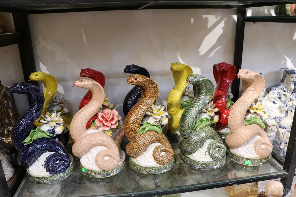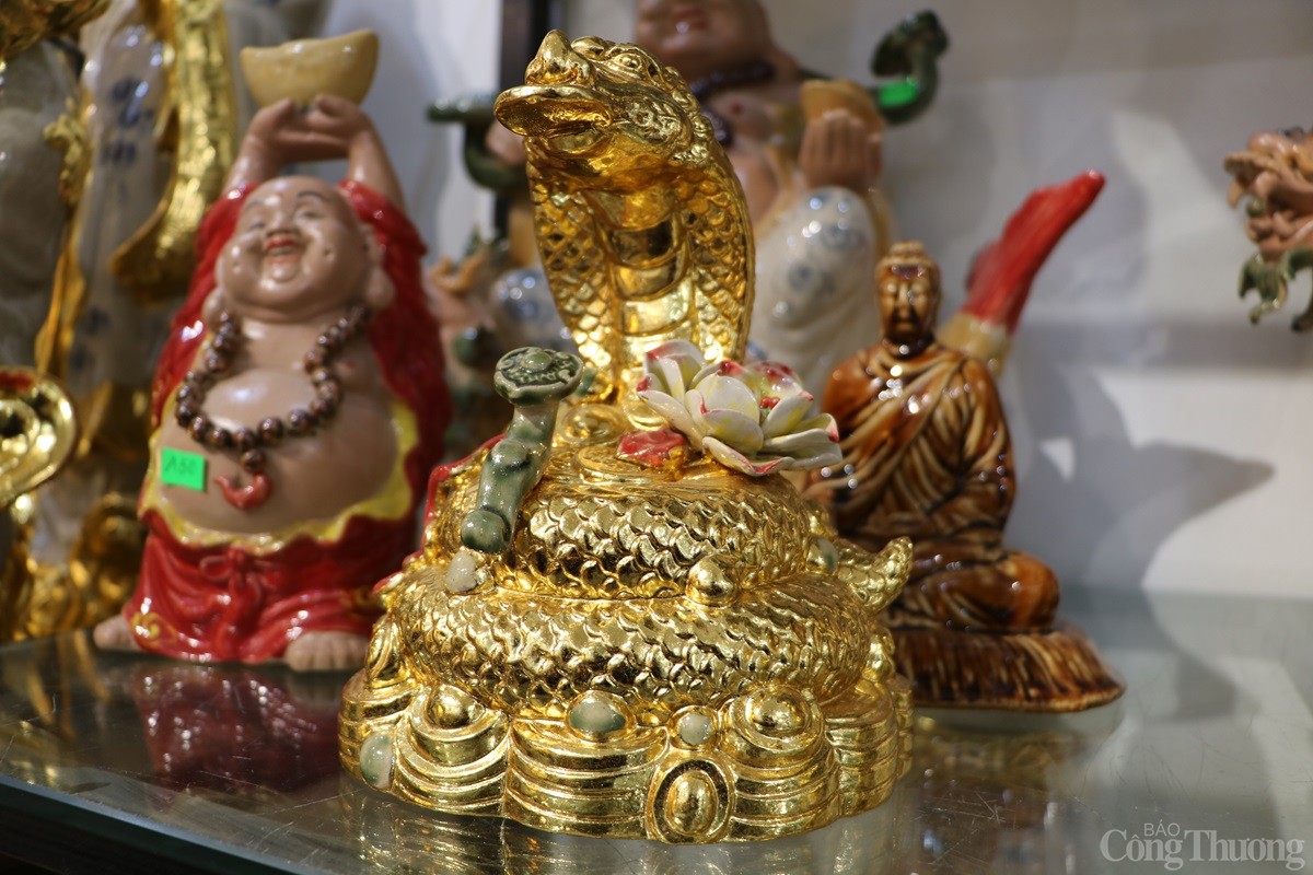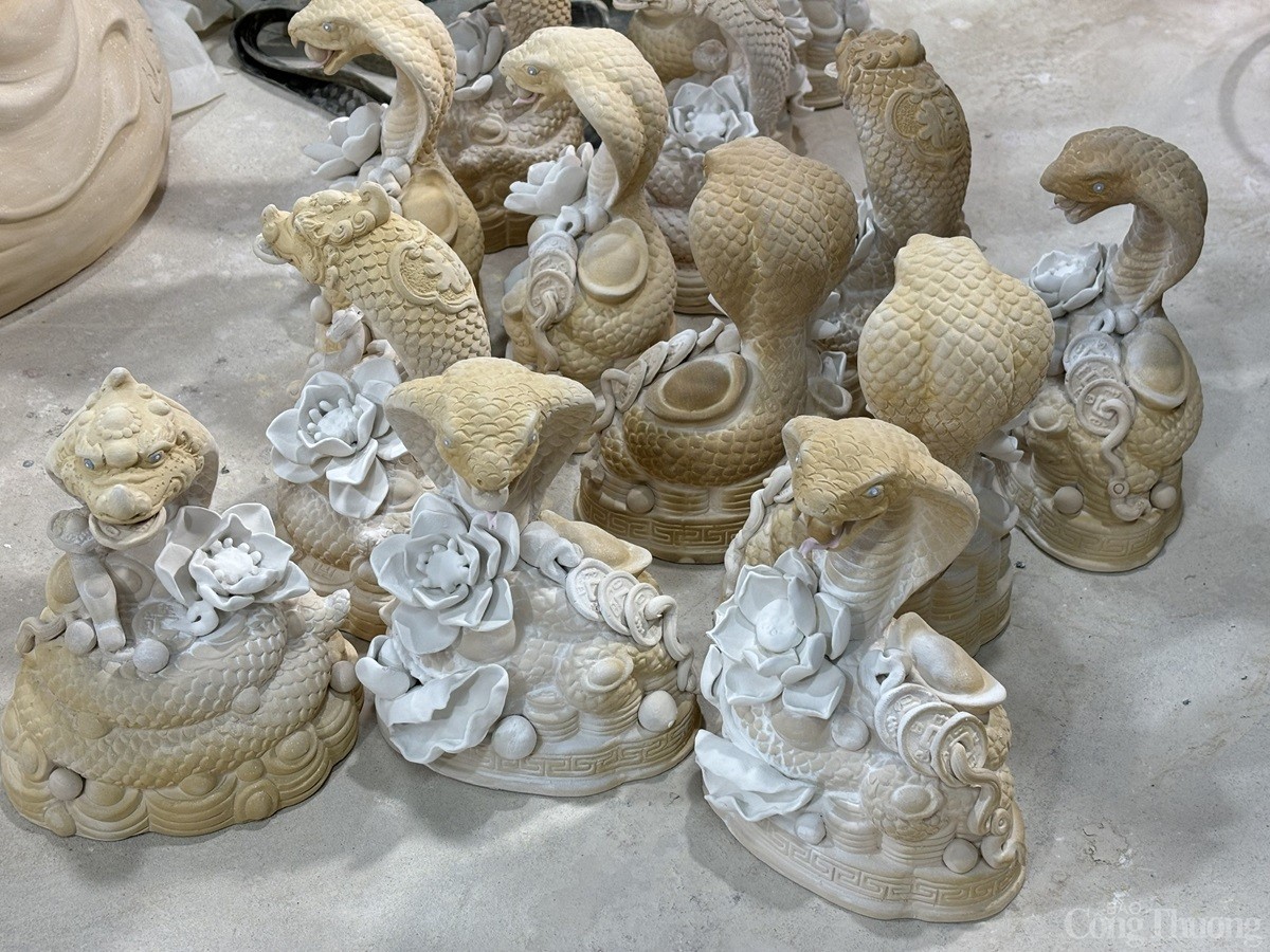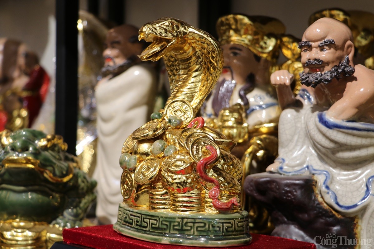 Tại làng nghề gốm sứ Bát Tràng (xã Bát Tràng, huyện Gia Lâm, Thành phố Hà Nội), các cơ sở sản xuất hàng gốm sứ đang tất bật cho ra các sản phẩm phục vụ Tết Nguyên đán 2025. Song song với những mặt hàng truyền thống như bát, chén, chậu, bình..., có cơ sở còn sản xuất mặt hàng linh vật rắn dát vàng 24k được nhiều người tiêu dùng săn đón.