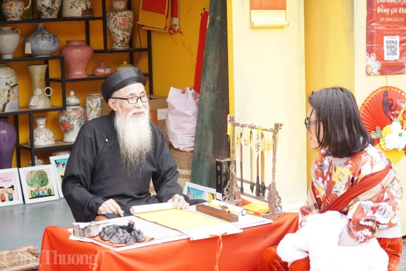 Nét Tết truyền thống còn được thể hiện qua các gian hàng xin chữ thầy đồ. Người Việt ta quan niệm rằng, xin chữ đầu năm là mong muốn cả một năm đều may mắn, bình an và phúc lộc thọ tràn ngập với bản thân cũng như gia đình mình. |