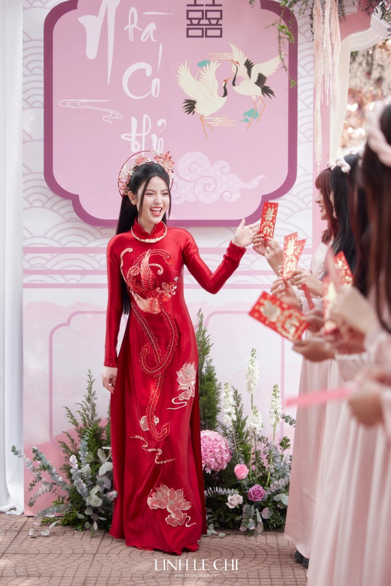 | Trong ngày ăn hỏi, cô dâu Chu Thanh Huyền xuất hiện sang trọng nổi bật trong chiếc áo dài màu đỏ truyền thống |