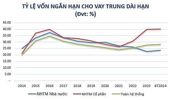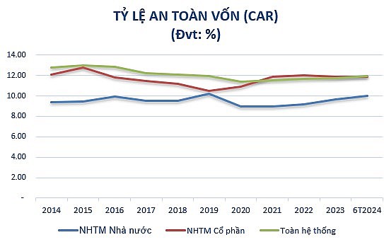 Sau 10 năm, tốc độ tăng trưởng vốn điều lệ cao, dẫn đến hệ số CAR của nhóm NHTM tư nhân cao hơn nhiều so với nhóm NHTM Nhà nước. Cụ thể, năm 2014, mức tỷ lệ an toàn vốn tối thiểu của nhóm NHTM Nhà nước là 9.4%, nhóm NHTM tư nhân là 12.07%. Đến tháng 6/2024, tỷ lệ an toàn vốn của nhóm NHTM cổ phần (11.86%) cũng cao hơn nhóm NHTM Nhà nước (9.99%), áp dụng theo Thông tư 41/2016/TT-NHNN.