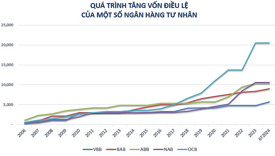 Những năm trở lại đây, các ngân hàng quy mô nhỏ và trung bình là nhóm ngân hàng chủ động tăng vốn điều lệ liên tục. Gia nhập đường đua tăng vốn trễ, nhưng tốc độ tăng trưởng lại nhanh hơn các ngân hàng khác sau 10 năm như OCB (5.8 lần), NamABank (3.5 lần), ABBank, BacABank và Vietbank tăng lên gấp đôi.